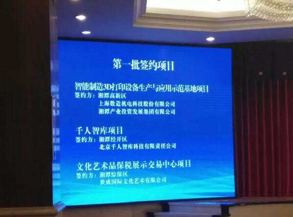 會議的簽約儀式中,上海數造機電科技股份有限公司作為第一家簽約公司,將在湘潭市高新區智造谷,成立3D打印設備生產及示范應用基地(擬成立湖南數造公司),總投資為3000萬元。將以3D打印設備生產、3D掃描及打印服務、3D設備應用示范、3D學院(3D教育)、行業云平臺服務為主要職能。
